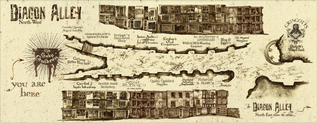 ワイズエーカー魔法用品店 →フローリアン・フォーテスキューのアイスクリームパーラー→フローリシュ・アンド・ブロッツ書店 →ウィーズリーウィザードウィーズ店
