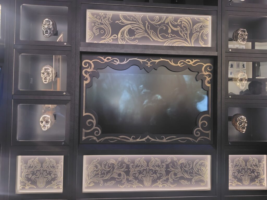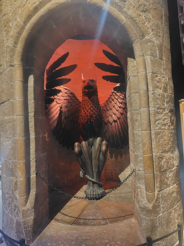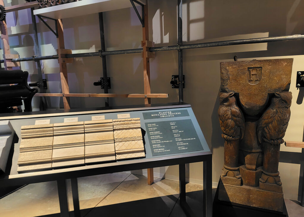壁一面に4つの寮をイメージした彫刻(ヘビ・アナグマ・ライオン・ワシ