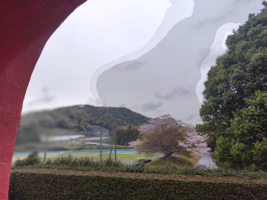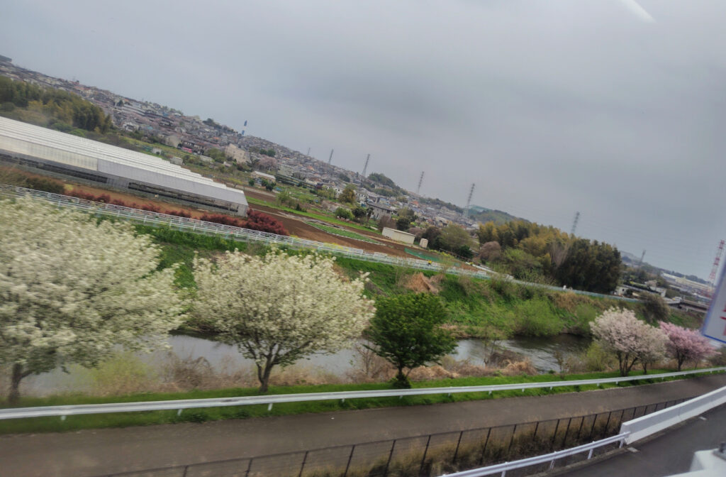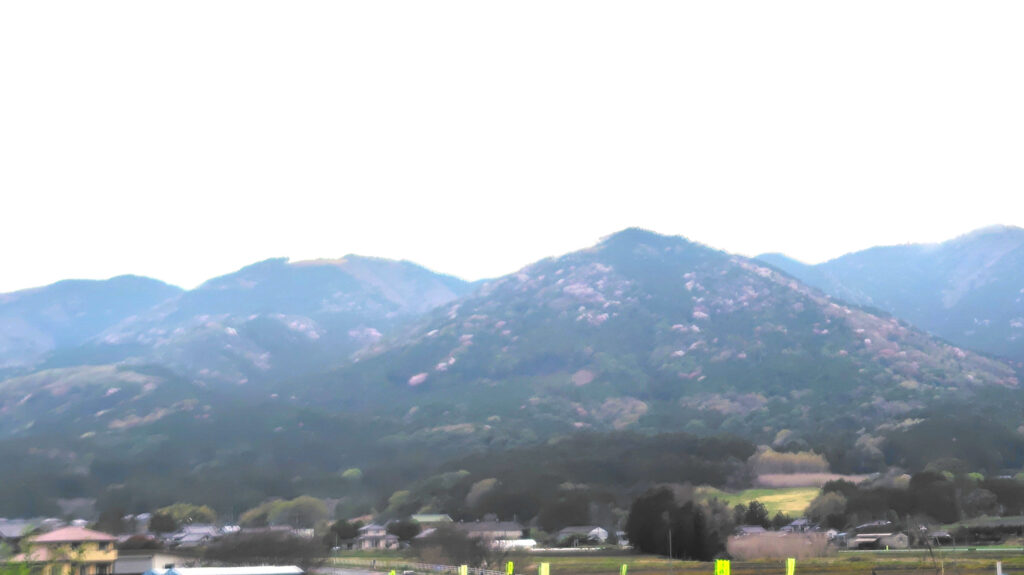 車内から山肌に桜