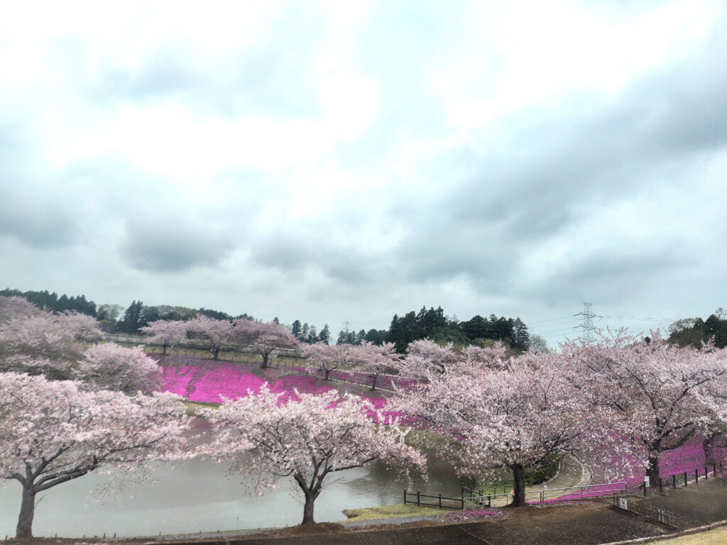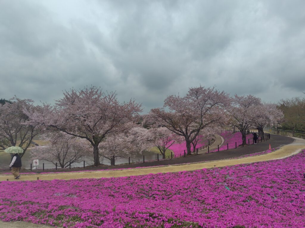 郡生海のほとりに濃桃の芝桜とソメイヨシノ