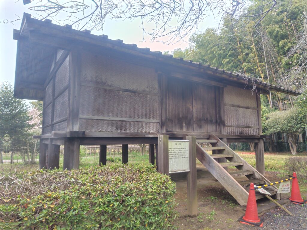 高床式倉庫 横板壁に竹網代 / 厚板流れ葺