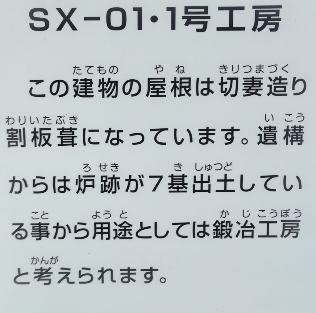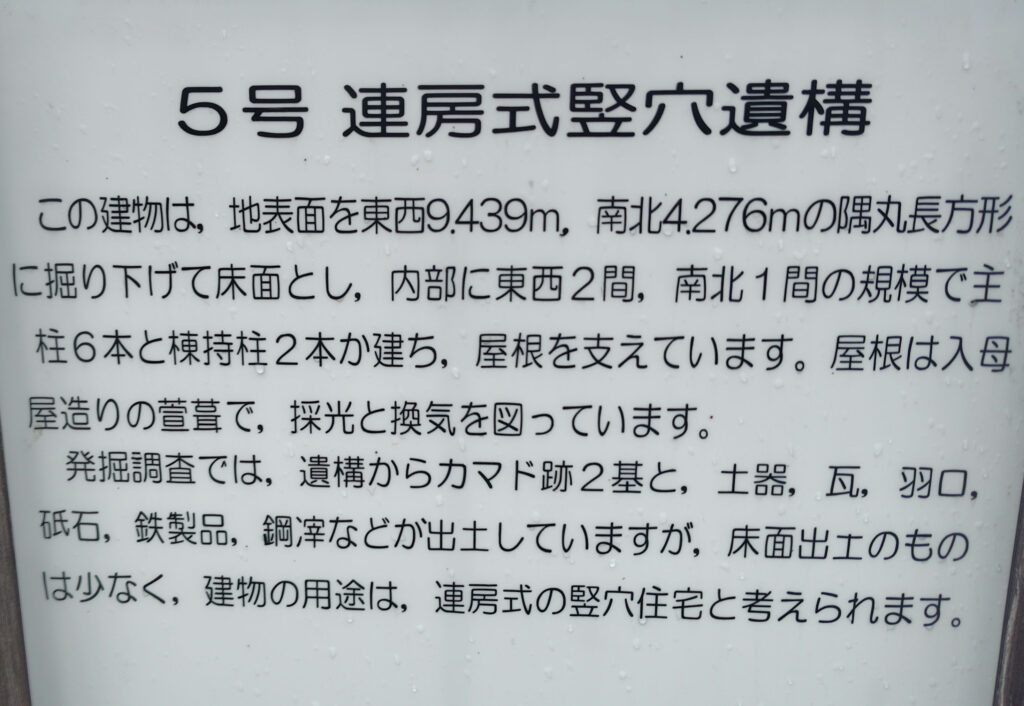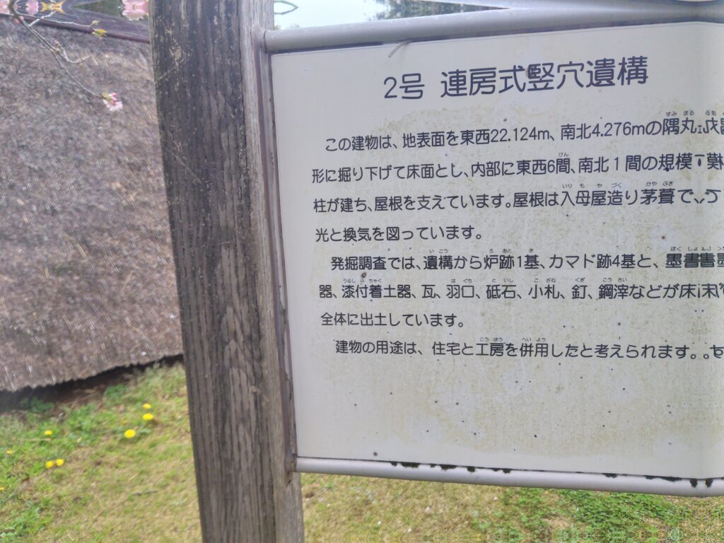 連房式竪穴遺構 住宅と工房の併用 / 入母屋造り茅葺 説明が見切れており残念