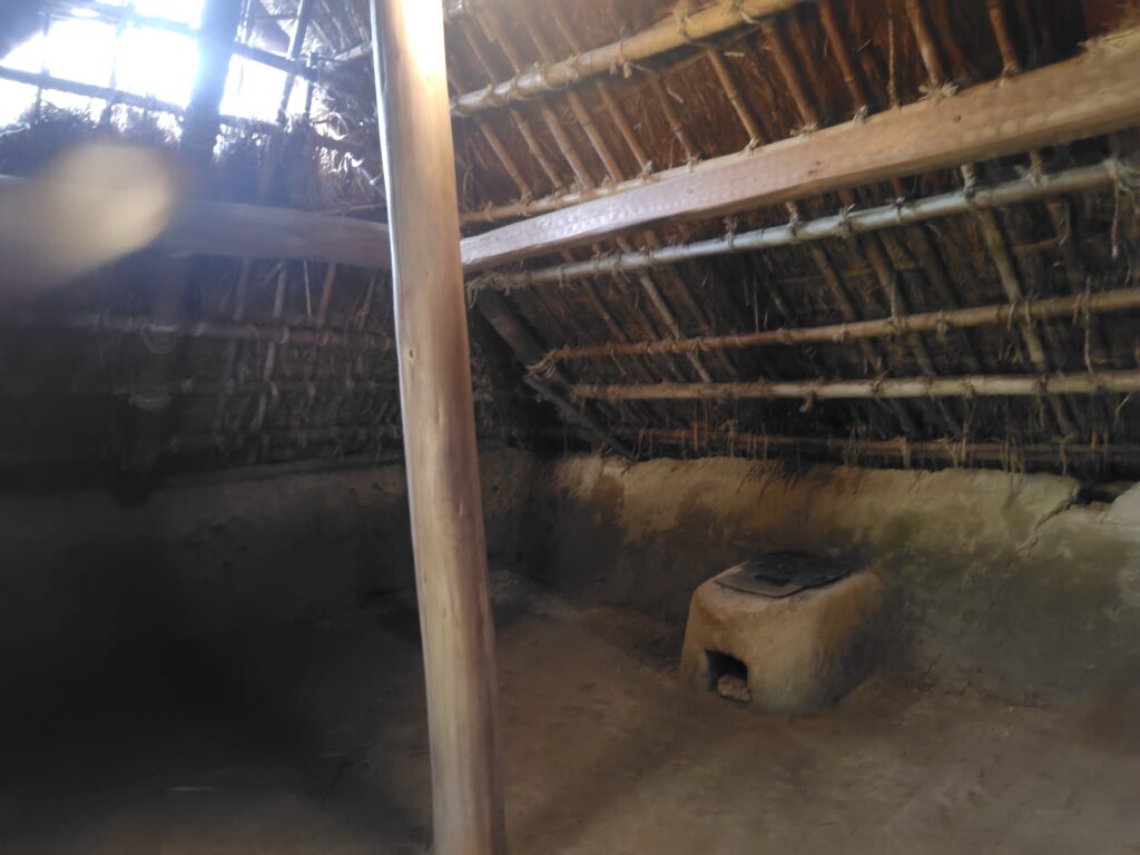 穴を掘り土や葦などの植物の屋根 / 土間に火は基本です