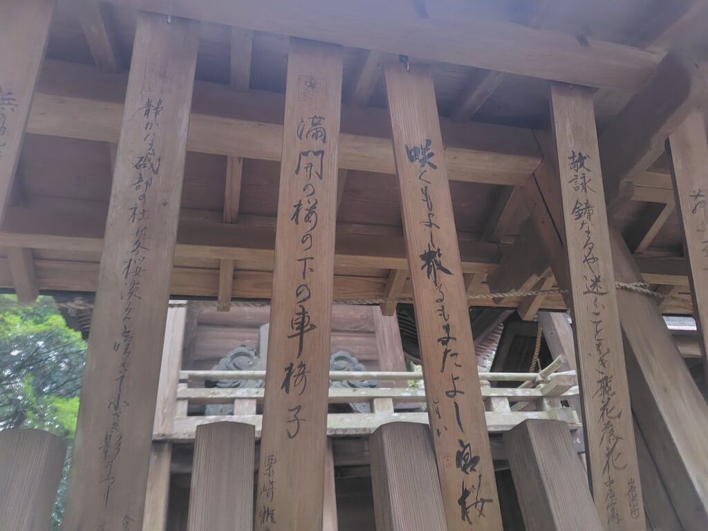 歌が描かれた木板が塀の構造物の一部になっています